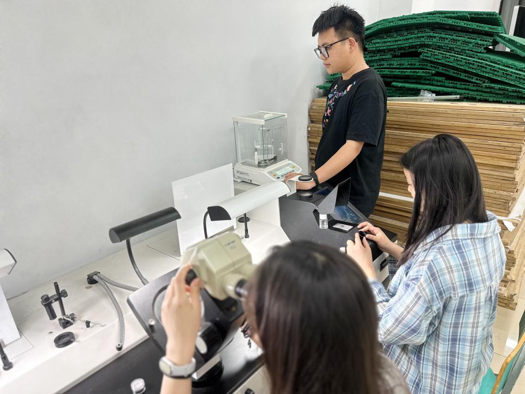 指导教师解析《珠宝玉石鉴定国家标准》的核心指标,强化学生“数据支撑结论,规范高于经验”的职业意识。在实践教学环节,获奖团队化身“匠师导师”,分组指导2024级学生上手操作,聚焦“仪器操作-数据判读-结论输出”技能链条,重点训练学生运用偏光镜判断玉石结构均匀性、使用比重天平测算翡翠密度、通过显微镜识别祖母绿裂隙修复痕迹等高阶能力。